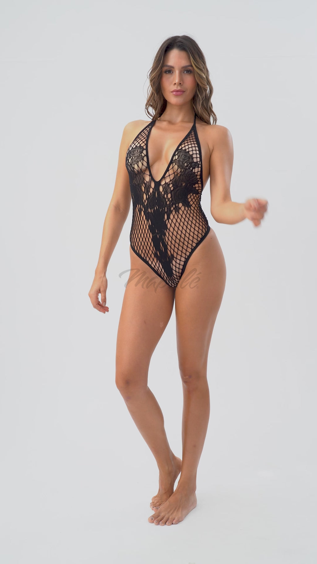 La combinaison de la résille, de l'imprimé floral et des détails en nœud rend ce body Mapalé parfait pour celles qui aiment la lingerie qui ne crie pas, mais qui murmure... tout en promettant tout.