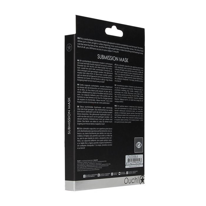 Plongez dans le côté obscur du désir avec ce Ouch ! Submission Mask. Ce capuchon brillant couvre toute la tête, réduisant la vision et mettant tous les autres sens en éveil. Votre partenaire entend, sent et ressent tout plus intensément, tandis que vous prenez le contrôle total.