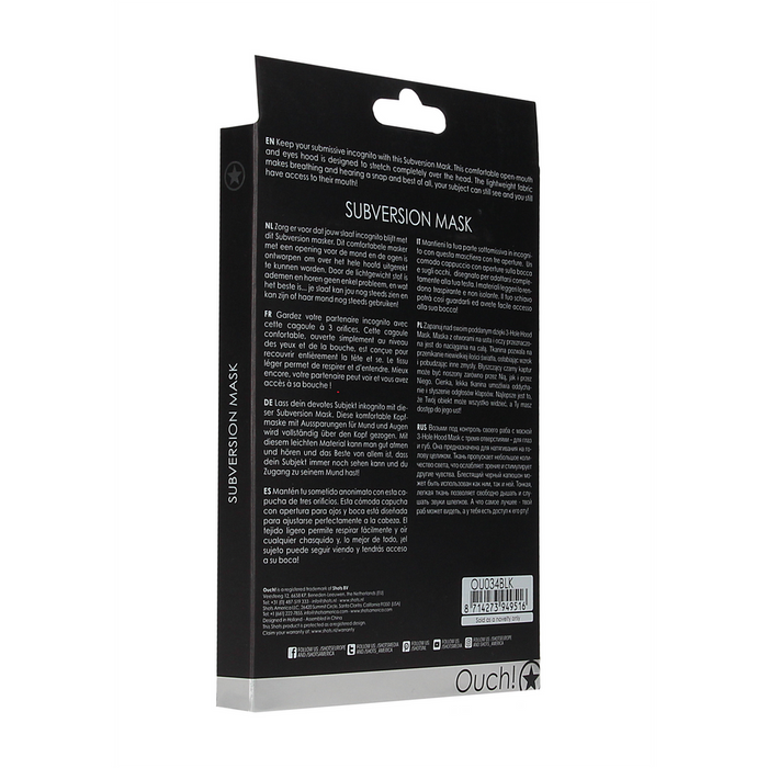 Vous voulez faire monter la tension et immerger votre partenaire dans le jeu ? Avec ce Ouch ! Subversion Mask vous apporterez instantanément une atmosphère mystérieuse dans la chambre à coucher. Cette cagoule noire aux yeux et à la bouche ouverts est parfaite pour les jeux de rôle, la domination et tout ce qui se trouve entre les deux. Laissez votre sujet s'immerger dans la soumission - vous tenez les rênes fermement dans vos mains.